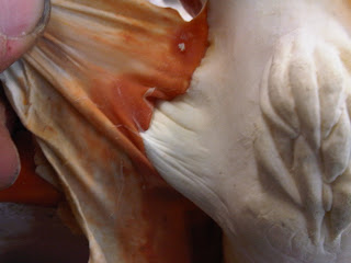 Out of curiosity I cut the belly of the fox open, expecting to find the latex soaked into the foam latex, but to my surprised the liquid latex formed a skin over the top of the foam latex that could be peeled off, revealed the untouched foam latex bellow.