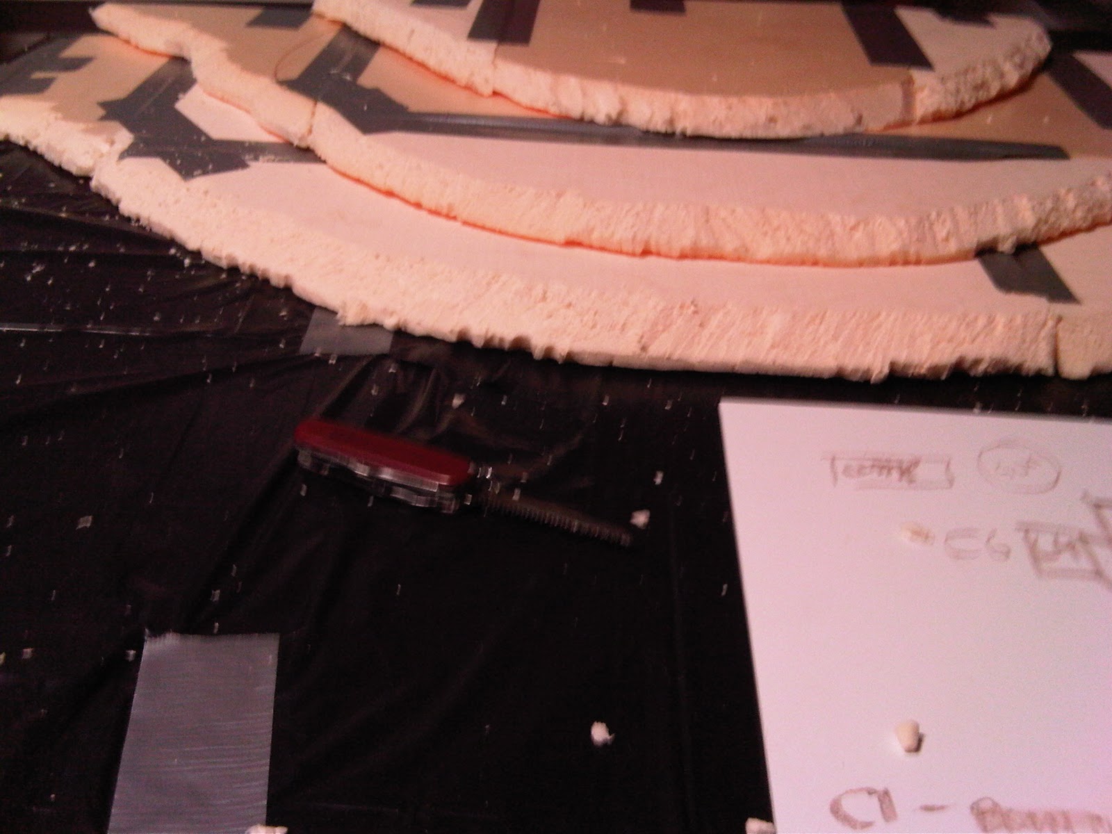 A high density pink foam is being used on the base to crease a banked/raised area in the forest. The rough shape of the area was simple cut out and taped into position use duck tape and hot melt glue.