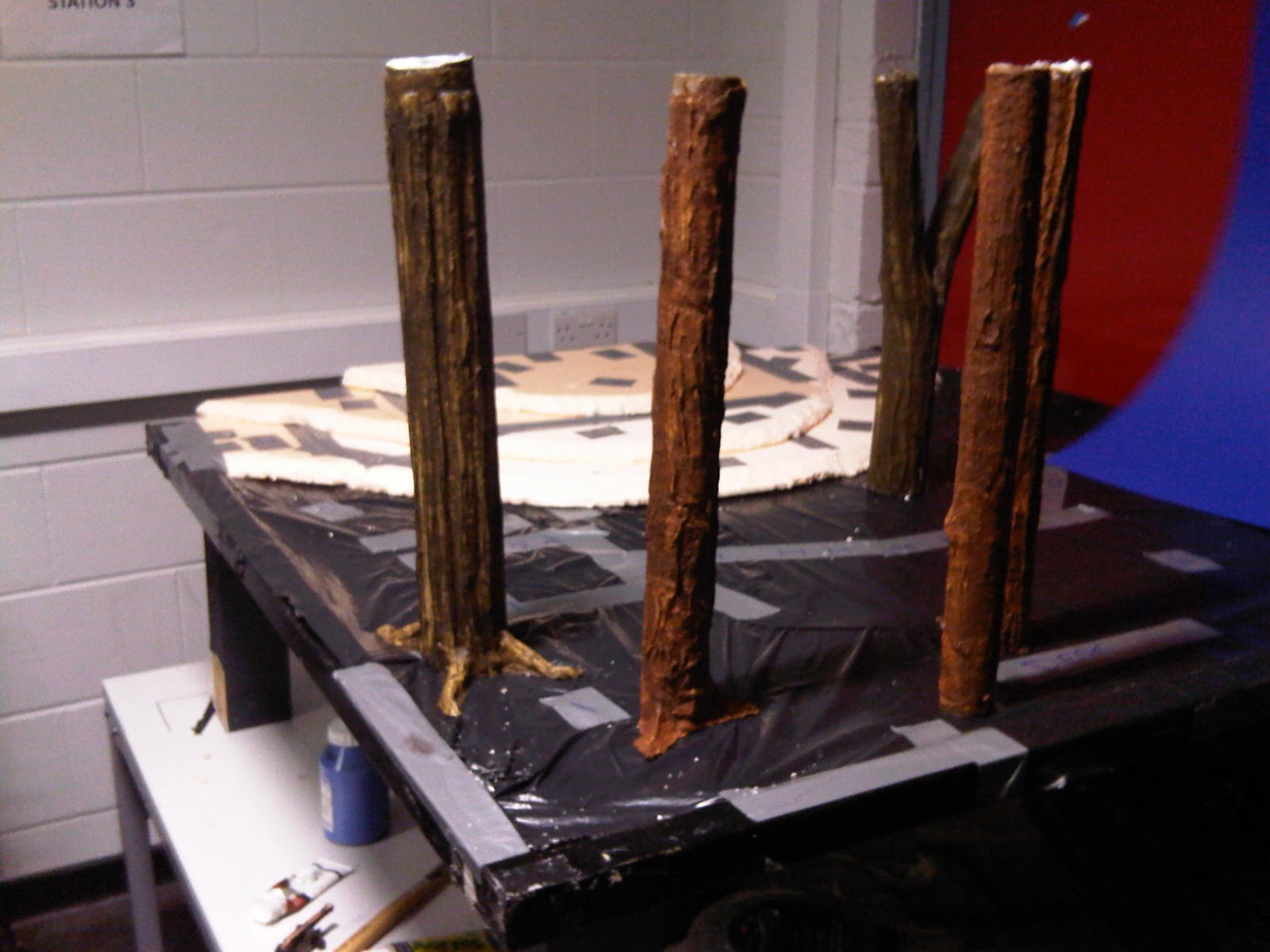 With the bare bones of the set now set up, May began work on the forest floor.