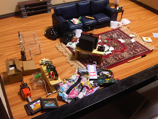 Here's the old TV and table that Tom made, with the games console I made sitting in position next to it, surround by the bags of rubbish made by May and Alex.
