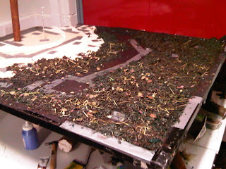 A high density pink foam is being used on the base to crease a banked/raised area in the forest. The rough shape of the area was simple cut out and taped into position use duck tape and hot melt glue.