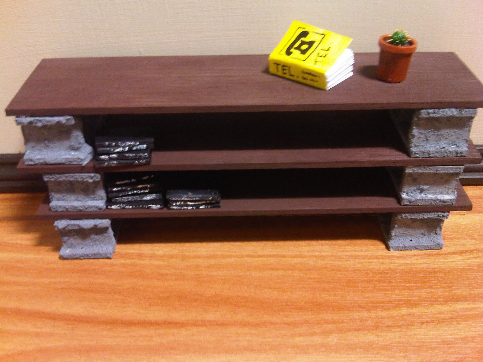 Here Alex made a student-esque make shift set of shelves made to look like concrete blocks and scaffolding planks. It's been made from foam board and balsa wood.